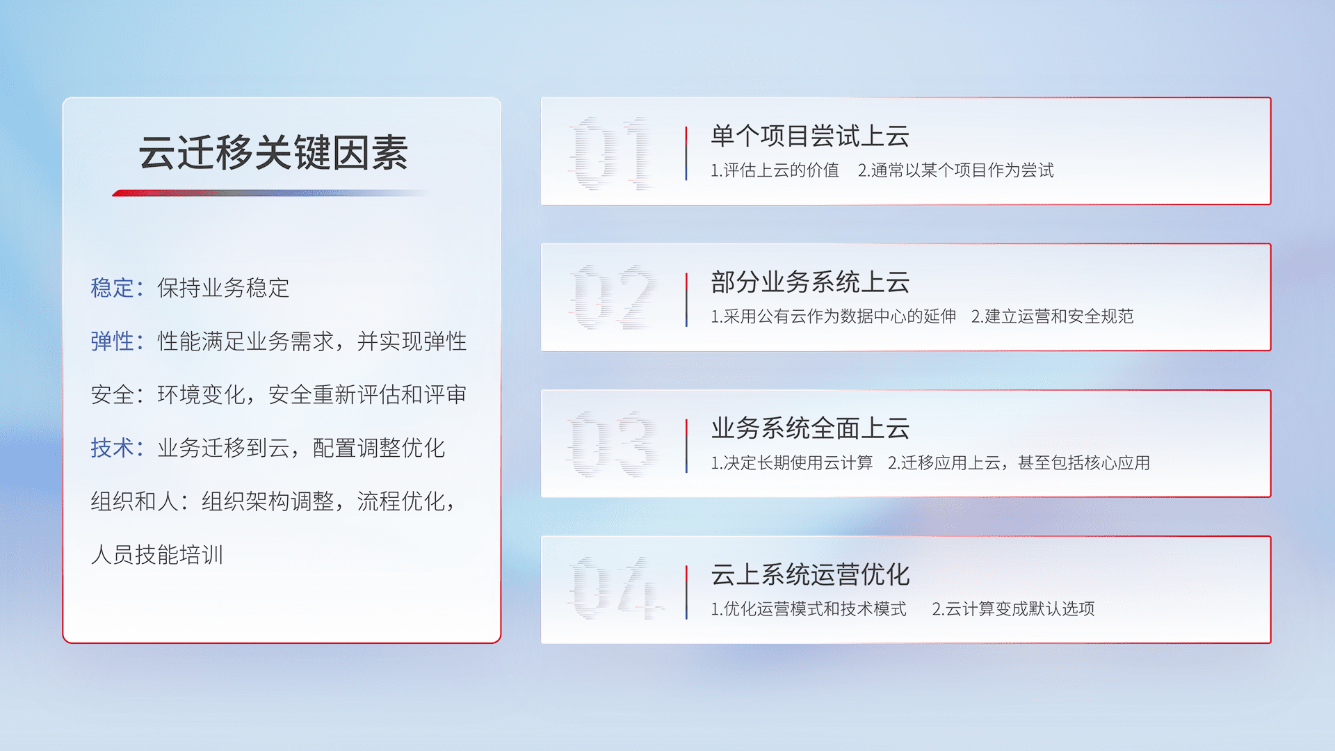 结合实际业务,,,从规划设计、、、云平台选型、、云原生改造、、数据迁移、、、集成交付,,,,迁移全过程为客户识别最佳上云路径,,,做好风险识别管理,,设计网络架构、、、身份权限、、、、安全审计合规、、、操作审计、、、、日志审计、、、、监控告警策略、、多站点容灾设计等,,,对云上基础设施进行整体规划,,,,提升IT治理水平,,以满足弹性、、、高可用、、、、高性能的需求。。。