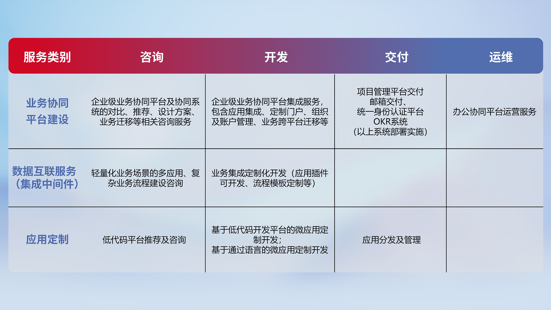 针对钉钉、、、、企微、、、IDaas等平台级产品提供产品的规划、、、、方案、、交付、、定制化开发等服务,,,,实现如统一协同办公、、智能客户服务、、、混合会议管理、、、、智能数据查询、、、等业务场景,,,实现数字化转型。。。
